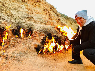 The Flaming Mountain "Yanar Dog" on the outskirts of Baku there is a natural gas fire which blazes continuously (yes Continuously) on a hillside, a spectacular thing to see.