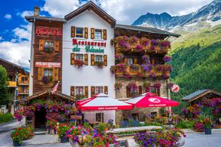 We crested a small pass then followed the lakeshore to the moraine of the Chelion Glacier where edelweiss flowers dot the rocky slopes. We crossed the dramatic Riedmatten Pass on newly-placed ladders and landings of the Pas de Chevre. The cloud coverage was intense on this day so we couldn't view what was suppose to be the first site of Matterhorn (far away), before descending into Arolla. Surely one of the most charming alpine villages along the route and a popular base for day hikes in the Swiss Alps.
